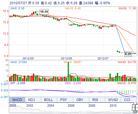 今 開: 6.39 成交量: 24387手 振 幅: 2.68% 最 高: 6.42 成交額: 1539.61萬 換手率: 0.27% 最 低: 6.25 總市值: 55.96億 市凈率: 1.06 昨 收: 6.34 流通市值...