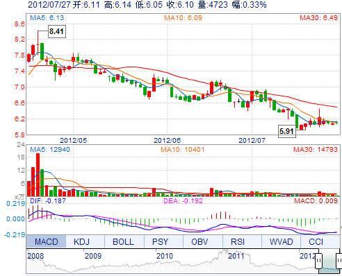 今 開(kāi): 6.11 成交量: 4722手 振 幅: 1.48% 最 高: 6.14 成交額: 287.85萬(wàn) 換手率: 0.17% 最 低: 6.05 總市值: 17.39億 市凈率: 2.79 昨 收: 6.08 流通市值: ...