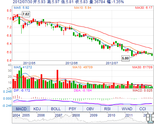 今 開: 5.93 成交量: 36784手 振 幅: 2.71% 最 高: 5.97 成交額: 2167.60萬 換手率: 0.39% 最 低: 5.81 總市值: 60.89億 市凈率: 2.05 昨 收: 5.91 流通市值...