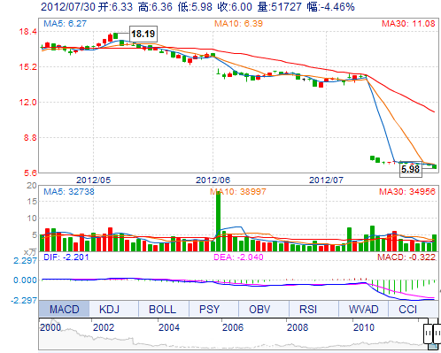 今 開(kāi): 6.33 成交量: 51726手 振 幅: 6.05% 最 高: 6.36 成交額: 3163.66萬(wàn) 換手率: 0.58% 最 低: 5.98 總市值: 53.47億 市凈率: 1.01 昨 收: 6.28 流通市值...