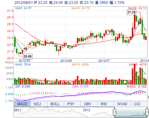 | 最 高: | 24.09 | 成交額: | 940.80萬(wàn) | 換手率: | 3.79% |