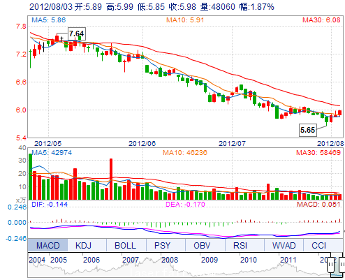 今 開: 5.89 成交量: 48060手 振 幅: 2.39% 最 高: 5.99 成交額: 2851.06萬(wàn) 換手率: 0.51% 最 低: 5.85 總市值: 62.45億 市凈率: 2.10 昨 收: 5.87 流通市值...
