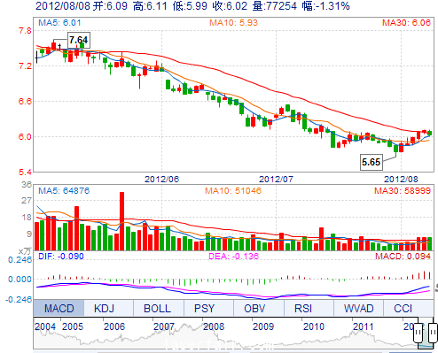 今 開: 6.09 成交量: 77253手 振 幅: 1.97% 最 高: 6.11 成交額: 4672.08萬 換手率: 0.82% 最 低: 5.99 總市值: 62.87億 市凈率: 2.11 昨 收: 6.10 流通市值...