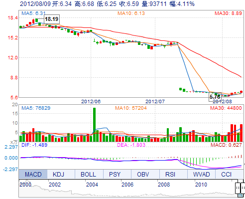 | 今 開: | 6.34 | 成交量: | 93710手 | 振 幅: | 6.79% |