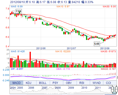 今 開: 6.10 成交量: 84209手 振 幅: 1.47% 最 高: 6.17 成交額: 5159.95萬 換手率: 0.89% 最 低: 6.08 總市值: 64.02億 市凈率: 2.15 昨 收: 6.11 流通市值...