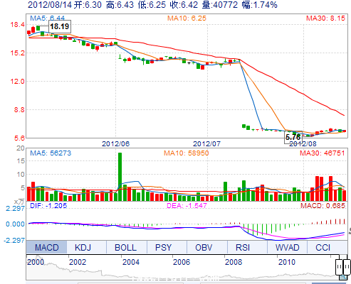 今 開: 6.30 成交量: 40772手 振 幅: 2.85% 最 高: 6.43 成交額: 2588.66萬 換手率: 0.46% 最 低: 6.25 總市值: 57.21億 市凈率: 1.08 昨 收: 6.31 流通市值...