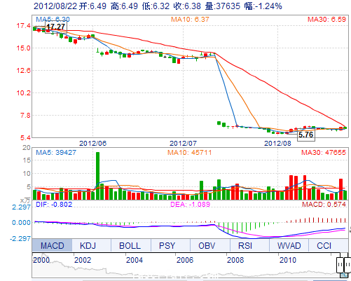 今 開: 6.49 成交量: 37634手 振 幅: 2.63% 最 高: 6.49 成交額: 2407.34萬 換手率: 0.42% 最 低: 6.32 總市值: 56.85億 市凈率: 1.08 昨 收: 6.46 流通市值...