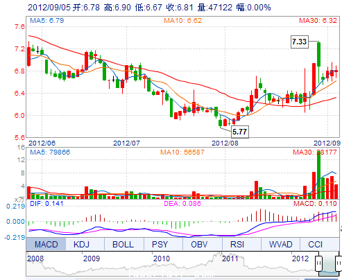 今 開: 6.78 成交量: 47121手 振 幅: 3.38% 最 高: 6.90 成交額: 3195.29萬 換手率: 1.71% 最 低: 6.67 總市值: 19.41億 市凈率: 3.23 昨 收: 6.81 流通市值...