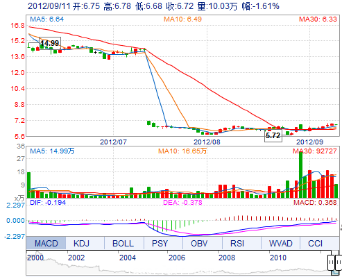 今 開(kāi): 6.75 成交量: 100253手 振 幅: 1.46%