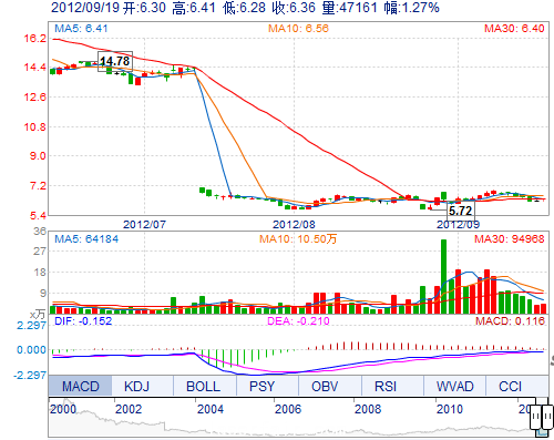 今 開: 6.30 成交量: 47160手 振 幅: 2.07% 最 高: 6.41 成交額: 2992.72萬 換手率: 0.53% 最 低: 6.28 總市值: 56.68億 市凈率: 1.09 昨 收: 6.28 流通市值...