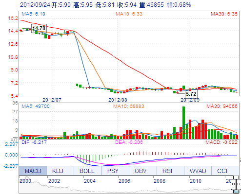 今 開: 5.90 成交量: 46855手 振 幅: 2.37% 最 高: 5.95 成交額: 2762.62萬 換手率: 0.53% 最 低: 5.81 總市值: 52.93億 市凈率: 1.02 昨 收: 5.90 流通市值...
