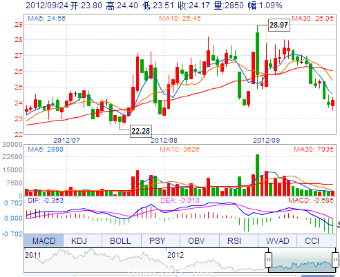 今 開: 23.80 成交量: 2850手 振 幅: 3.72% 最 高: 24.40 成交額: 685.50萬 換手率: 2.72% 最 低: 23.51 總市值: 8.46億 市凈率: 2.98 昨 收: 23.91 流通市值...