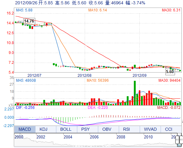 今 開: 5.85 成交量: 46964手 振 幅: 4.42% 最 高: 5.86 成交額: 2687.74萬 換手率: 0.53% 最 低: 5.60 總市值: 50.44億 市凈率: 0.97 昨 收: 5.88 流通市值...