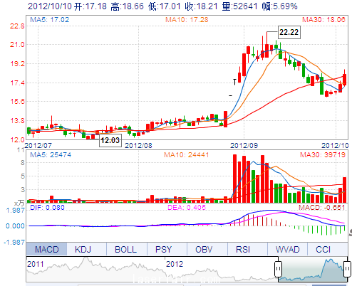 | 今 開(kāi): | 17.18 | 成交量: | 52641手 | 振 幅: | 9.58% |