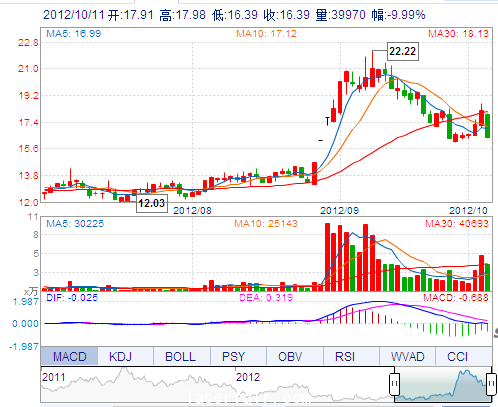 今 開: 17.91 成交量: 39969手 振 幅: 8.73% 最 高: 17.98 成交額: 6811.66萬(wàn) 換手率: 12.00% 最 低: 16.39 總市值: 10.98億 市凈率: 3.52 昨 收: 18.21 流通...