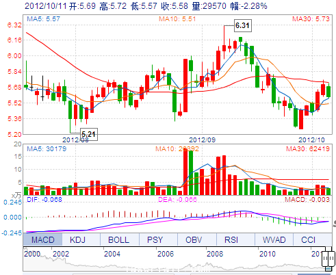 今 開: 5.69 成交量: 29570手 振 幅: 2.63% 最 高: 5.72 成交額: 1666.78萬(wàn) 換手率: 0.68% 最 低: 5.57 總市值: 24.37億 市凈率: 1.78 昨 收: 5.71 流通市值...
