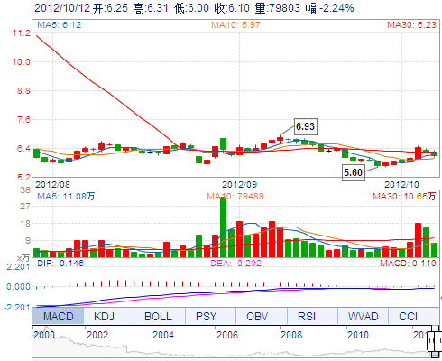 今 開: 6.25 成交量: 79802手 振 幅: 4.97% 最 高: 6.31 成交額: 4901.44萬 換手率: 0.90% 最 低: 6.00 總市值: 54.36億 市凈率: 1.05 昨 收: 6.24 流通市值...