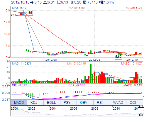 今 開: 6.15 成交量: 73113手 振 幅: 2.95% 最 高: 6.31 成交額: 4549.04萬 換手率: 0.82% 最 低: 6.13 總市值: 55.25億 市凈率: 1.07 昨 收: 6.10 流通市值...