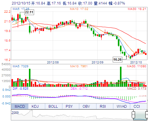 今 開: 16.84 成交量: 4143手 振 幅: 1.87% 最 高: 17.16 成交額: 704.06萬 換手率: 0.35% 最 低: 16.84 總市值: 72.62億 市凈率: 5.18 昨 收: 17.15 流通市...