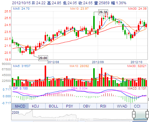 今 開(kāi): 24.22 成交量: 25858手 振 幅: 3.29% 最 高: 24.85 成交額: 6320.25萬(wàn) 換手率: 1.41% 最 低: 24.05 總市值: 73.37億 市凈率: 5.77 昨 收: 24.32 流通...