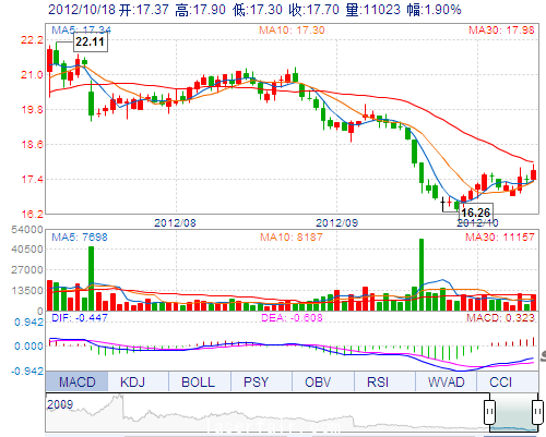 今 開: 17.37 成交量: 11023手 振 幅: 3.45% 最 高: 17.90 成交額: 1953.00萬 換手率: 0.92% 最 低: 17.30 總市值: 75.61億 市凈率: 5.40 昨 收: 17.37 流通...