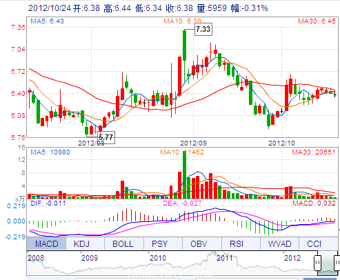 今 開(kāi): 6.38 成交量: 5958手 振 幅: 1.56% 最 高: 6.44 成交額: 380.60萬(wàn) 換手率: 0.22% 最 低: 6.34 總市值: 18.18億 市凈率: 2.97 昨 收: 6.40 流通市值: ...