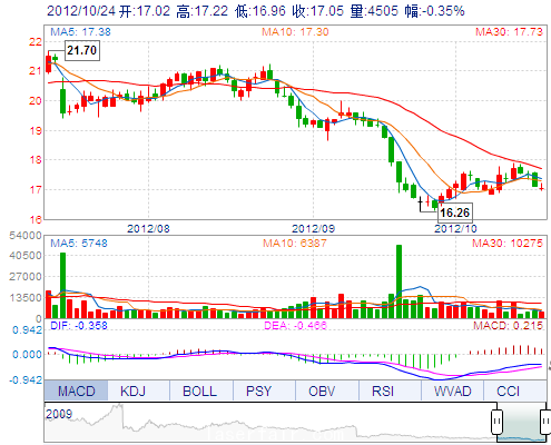 今 開: 17.02 成交量: 4505手 振 幅: 1.52% 最 高: 17.22 成交額: 770.23萬 換手率: 0.38% 最 低: 16.96 總市值: 72.84億 市凈率: 5.20 昨 收: 17.11 流通市...