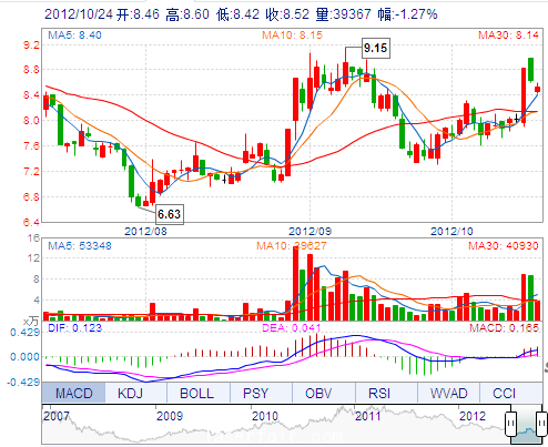 今 開: 8.46 成交量: 39367手 振 幅: 2.09% 最 高: 8.60 成交額: 3344.14萬(wàn) 換手率: 2.03% 最 低: 8.42 總市值: 16.98億 市凈率: 3.42 昨 收: 8.63 流通市值...