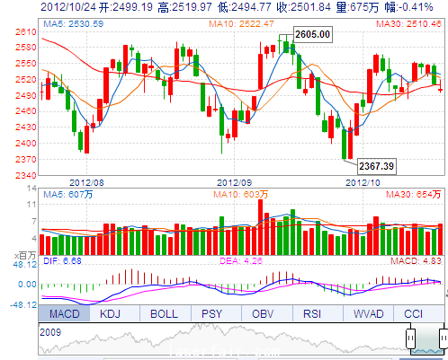 今 開: 2499.19 最 高: 2519.97 最 低: 2494.77 振 幅: 1.00% 昨 收: 2512.26 成交量: 6750323手 成交額: 537448.48萬 換手率: --