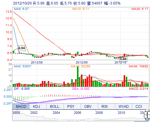 今 開: 5.96 成交量: 54666手 振 幅: 4.82% 最 高: 6.05 成交額: 3211.45萬(wàn) 換手率: 0.61% 最 低: 5.76 總市值: 51.68億 市凈率: 1.00 昨 收: 6.02 流通市值...