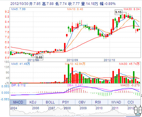 今 開: 7.85 成交量: 141841手 振 幅: 1.79% 最 高: 7.88 成交額: 11056.82萬 換手率: 1.50% 最 低: 7.74 總市值: 81.15億 市凈率: 2.51 昨 收: 7.84 流通市...