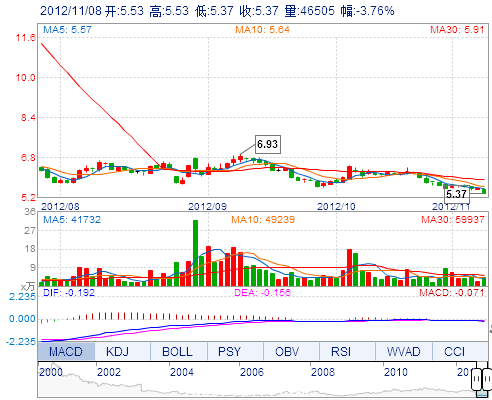 今 開: 5.53 成交量: 46505手 振 幅: 2.87% 最 高: 5.53 成交額: 2528.57萬 換手率: 0.52% 最 低: 5.37 總市值: 47.85億 市凈率: 1.83 昨 收: 5.58 流通市值...