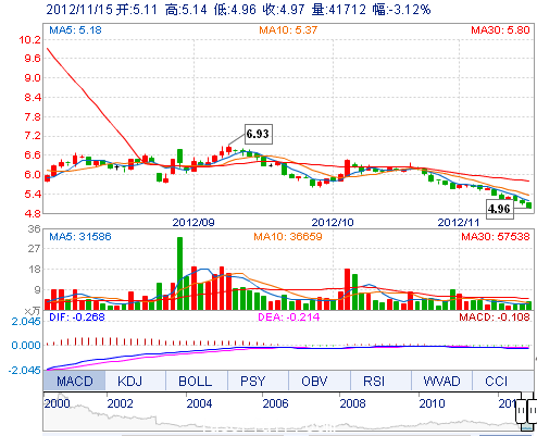 今 開(kāi): 5.11 成交量: 41711手 振 幅: 3.51% 最 高: 5.14 成交額: 2103.97萬(wàn) 換手率: 0.47% 最 低: 4.96 總市值: 44.29億 市凈率: 1.70 昨 收: 5.13 流通市值...