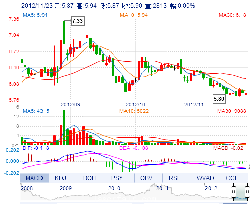 今 開(kāi): 5.87 成交量: 2812手 振 幅: 1.19% 最 高: 5.94 成交額: 166.02萬(wàn) 換手率: 0.10% 最 低: 5.87 總市值: 16.82億 市凈率: 2.74 昨 收: 5.90 流通市值: ...