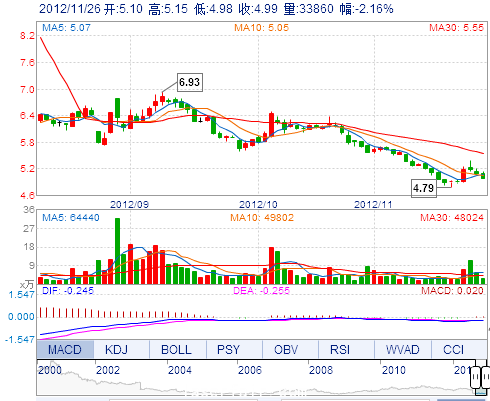 今 開: 5.10 成交量: 33859手 振 幅: 3.33% 最 高: 5.15 成交額: 1708.95萬 換手率: 0.38% 最 低: 4.98 總市值: 44.47億 市凈率: 1.70 昨 收: 5.10 流通市值...