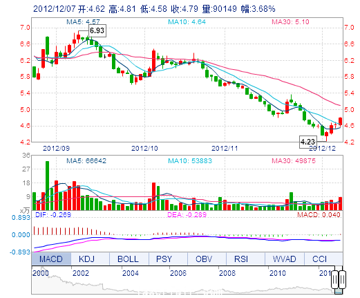 今 開: 4.62 成交量: 9.01萬手 振 幅: 4.98% 最 高: 4.81 成交額: 4252.73萬元 換手率: 1.01% 最 低: 4.58 總市值: 42.68億 市凈率: 1.63 昨 收: 4.62 流通市...