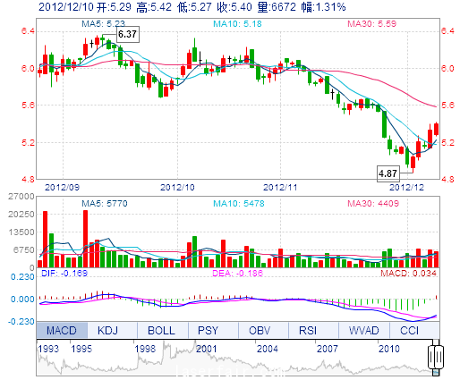 今 開(kāi): 5.29 成交量: 6672手 振 幅: 2.81% 最 高: 5.42 成交額: 356.99萬(wàn)元 換手率: 0.38% 最 低: 5.27 總市值: 9.38億 市凈率: 2.40 昨 收: 5.33 流通市值:...