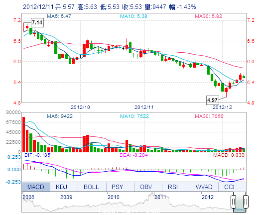 今 開: 5.57 成交量: 9447手 振 幅: 1.78% 最 高: 5.63 成交額: 526.12萬元 換手率: 0.34% 最 低: 5.53 總市值: 15.76億 市凈率: 2.57 昨 收: 5.61 流通市值...