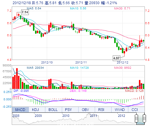今 開: 5.76 成交量: 2.09萬手 振 幅: 2.60% 最 高: 5.81 成交額: 1202.47萬元 換手率: 0.76% 最 低: 5.66 總市值: 16.27億 市凈率: 2.66 昨 收: 5.78 流通市...