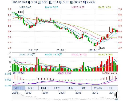 今 開: 5.36 成交量: 8.83萬手 振 幅: 3.90% 最 高: 5.55 成交額: 4832.83萬元 換手率: 0.99% 最 低: 5.34 總市值: 49.10億 市凈率: 1.88 昨 收: 5.38 流通市...