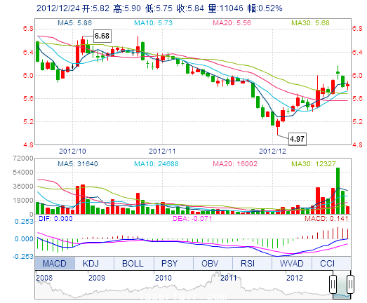 今 開: 5.82 成交量: 1.10萬手 振 幅: 2.58% 最 高: 5.90 成交額: 644.23萬元 換手率: 0.40% 最 低: 5.75 總市值: 16.64億 市凈率: 2.72 昨 收: 5.81 流通市...