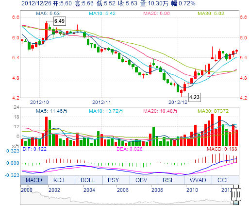 | 今 開: | 5.60 | 成交量: | 10.30萬手 | 振 幅: | 2.50% |