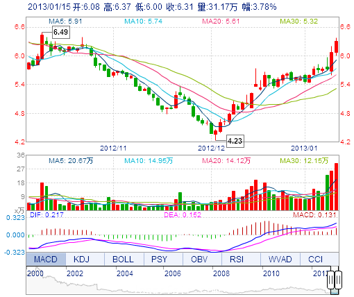 今 開: 6.08 成交量: 31.17萬手 振 幅: 6.09% 最 高: 6.37 成交額: 1.94億元 換手率: 3.50% 最 低: 6.00 總市值: 56.23億 市凈率: 2.15 昨 收: 6.08 流通市值...