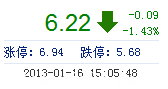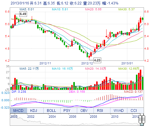 今 開: 6.31 成交量: 20.23萬手 振 幅: 3.65% 最 高: 6.35 成交額: 1.26億元 換手率: 2.27% 最 低: 6.12 總市值: 55.43億 市凈率: 2.12 昨 收: 6.31 流通市值...