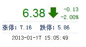 | 今 開: | 6.48 | 成交量: | 2.64萬手 | 振 幅: | 2.76% |