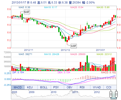 今 開: 6.48 成交量: 2.64萬手 振 幅: 2.76% 最 高: 6.51 成交額: 1687.65萬元 換手率: 0.96% 最 低: 6.33 總市值: 18.18億 市凈率: 2.97 昨 收: 6.51 流通市...