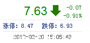 今開: 7.65 成交量: 21.47萬手 振幅: 2.99% 最高: 7.65 成交額: 1.62億元 換手率: 2.41% 最低: 7.42 總市值: 67.99億 市凈率: 2.60 昨收: 7.70 流通市值: 67...