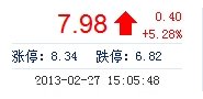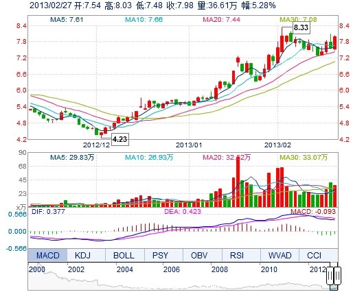 今開: 7.54 成交量: 36.61萬(wàn)手 振幅: 7.26% 最高: 8.03 成交額: 2.86億元 換手率: 4.11% 最低: 7.48 總市值: 71.11億 市凈率: 2.72 昨收: 7.58 流通市值: 71...