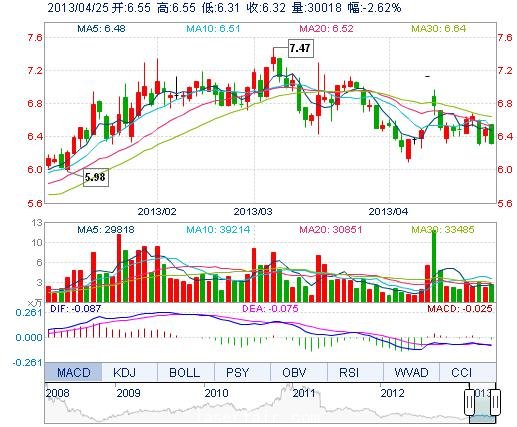 | 今 開: | 6.55 | 成交量: | 3.00萬手 | 振 幅: | 3.70% |