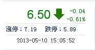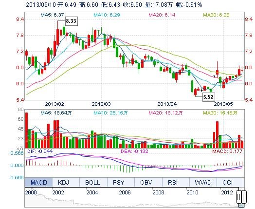今開: 6.49 成交量: 17.08萬手 振幅: 2.60% 最高: 6.60 成交額: 1.11億元 換手率: 1.92% 最低: 6.43 總市值: 57.92億 市凈率: 2.21 昨收: 6.54 流通市值: 57...